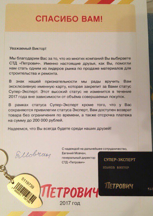 Скидочная Карта Петрович № 5119739 имеет самый высокий статус : «Супер-Эксперт»-Высшая Лига! Только по этому статусу возврат товара в магазин Петрович, через год и даже более-без ограничения времени