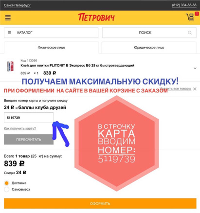 Как воспользоваться скидочной картой на сайте, или в приложении «Петрович»?Для этого, при оформлении вашего заказа в корзине, в строчке «номер карты» вводите номер: 5119739 и будет применена максимальная скидка!